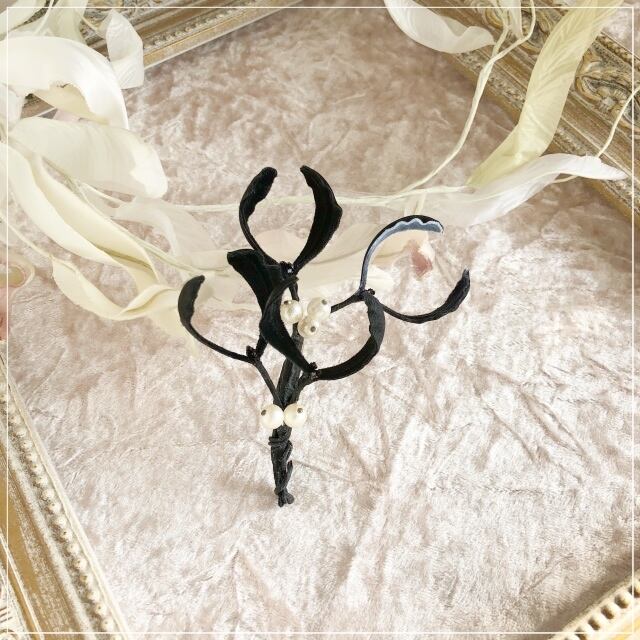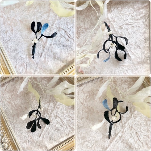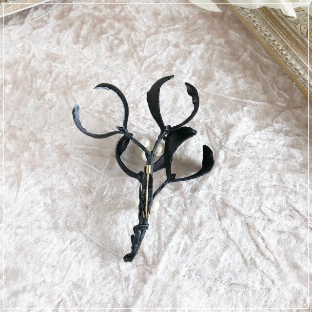 黒とグレーのリーフにパール調の実をつけ、サイズは小さめに仕立てました。
